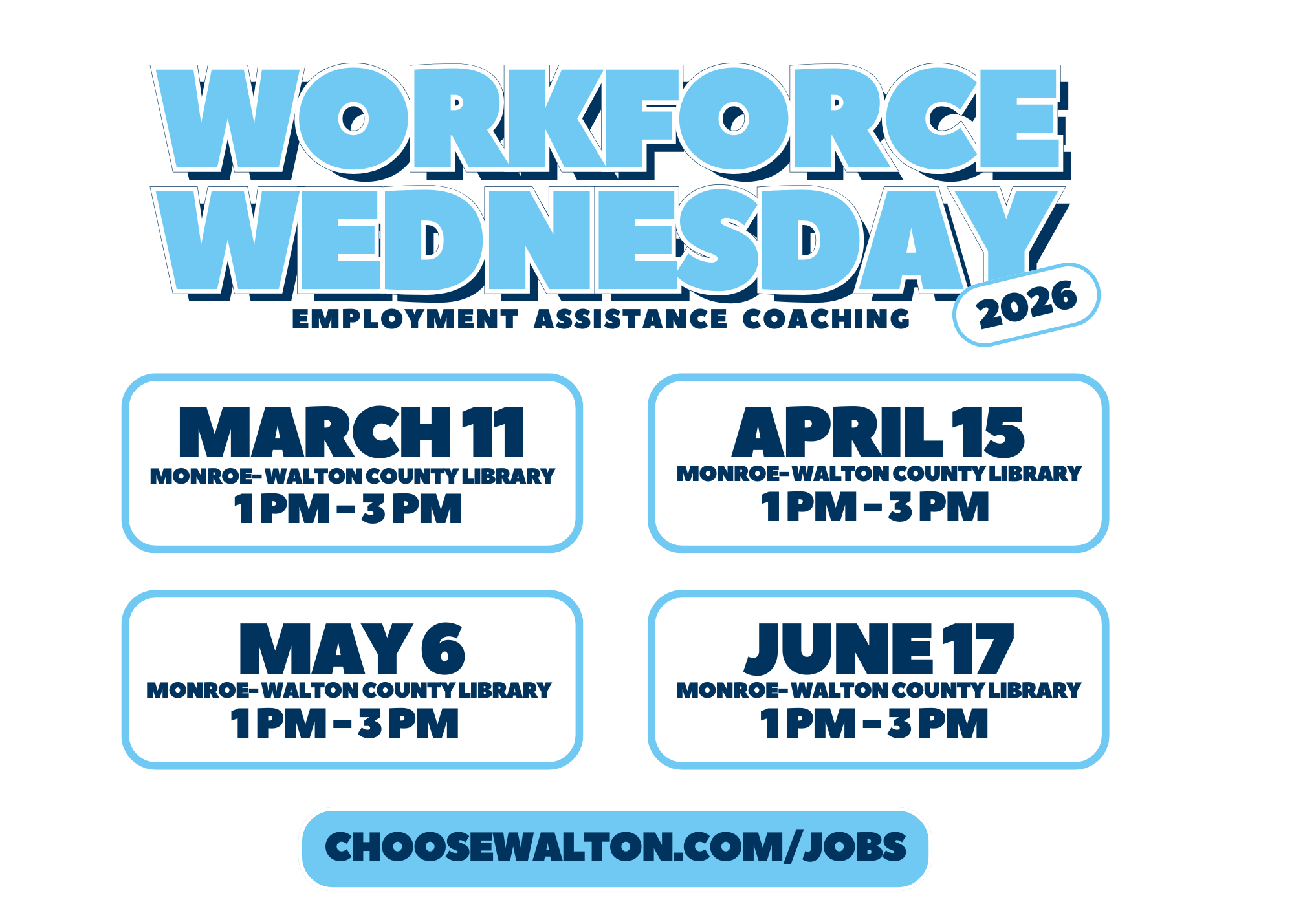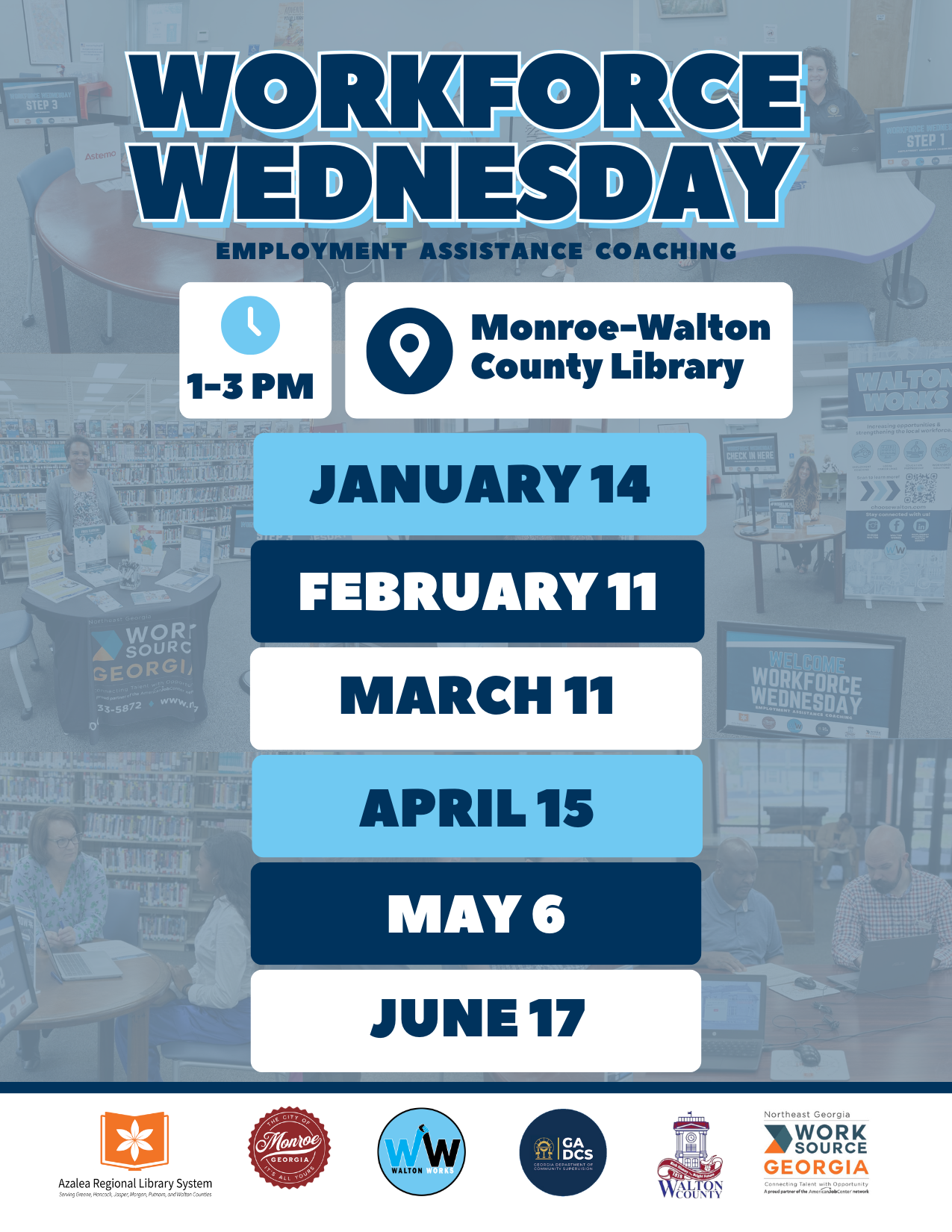 Walton Works’ Workforce Wednesdays is an employment assistance coaching event in partnership with the City of Monroe, Walton County, the Monroe-Walton County Library, and the Georgia Department of Community Supervision.